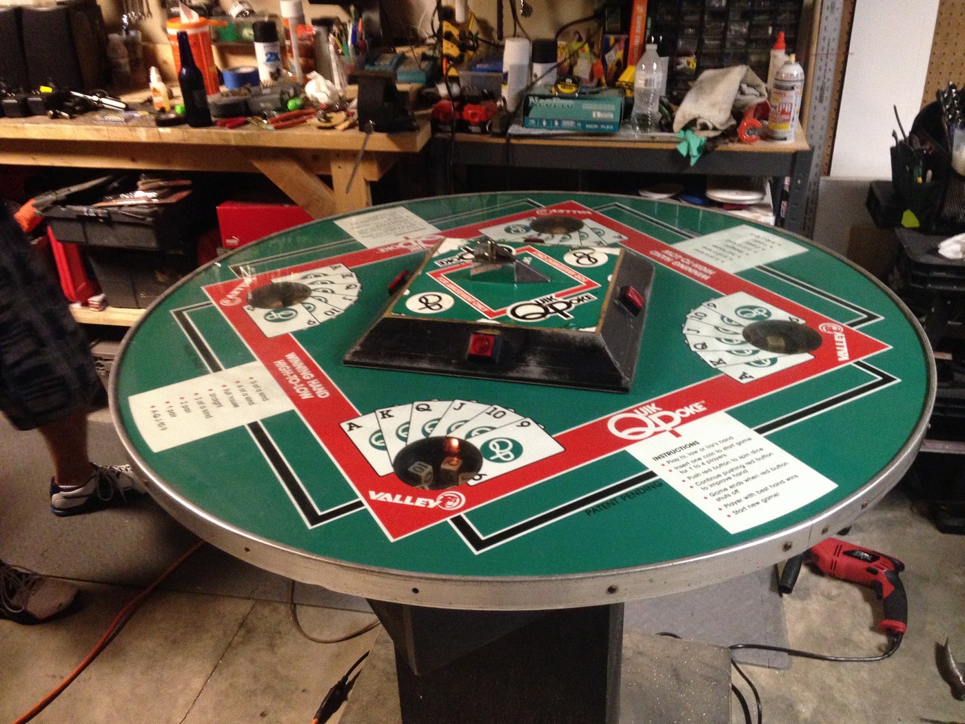 was a very unique coin op in that it was a perfect bar table height, you can set your drinks on it, and it had a card game with dice. The game has 4 player view windows of the dice, it starts to shake